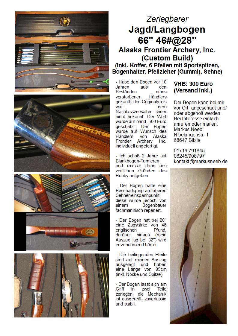 Einmal verkaufe ich meinen alten Jagdbogen, da Reinhard ja LARP-Technisch aktiv ist, kennt er vielleicht jemanden der Interesse hat (über den Preis lässt sich ja noch reden):